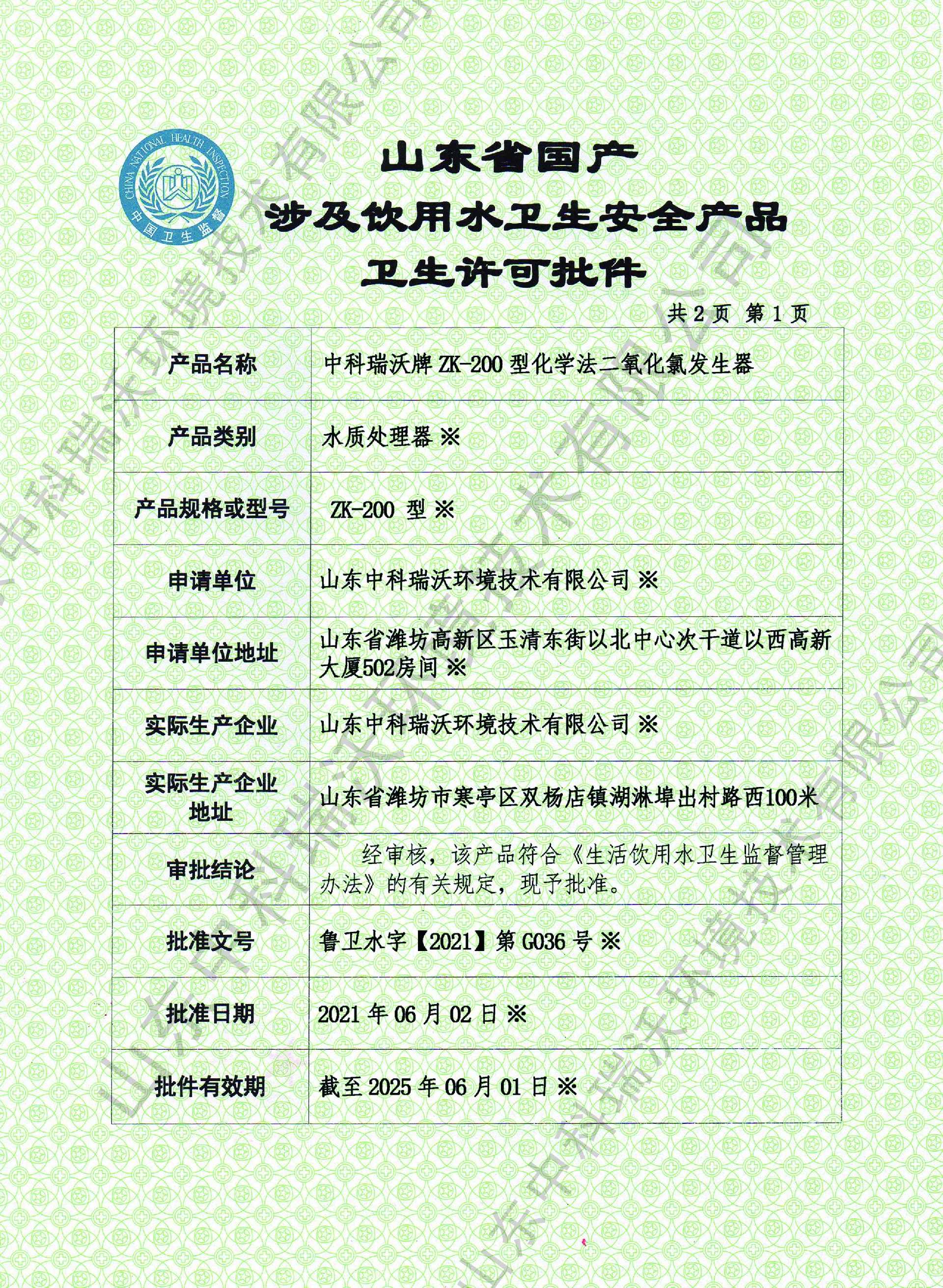 二氧化氯衛(wèi)生許可批件