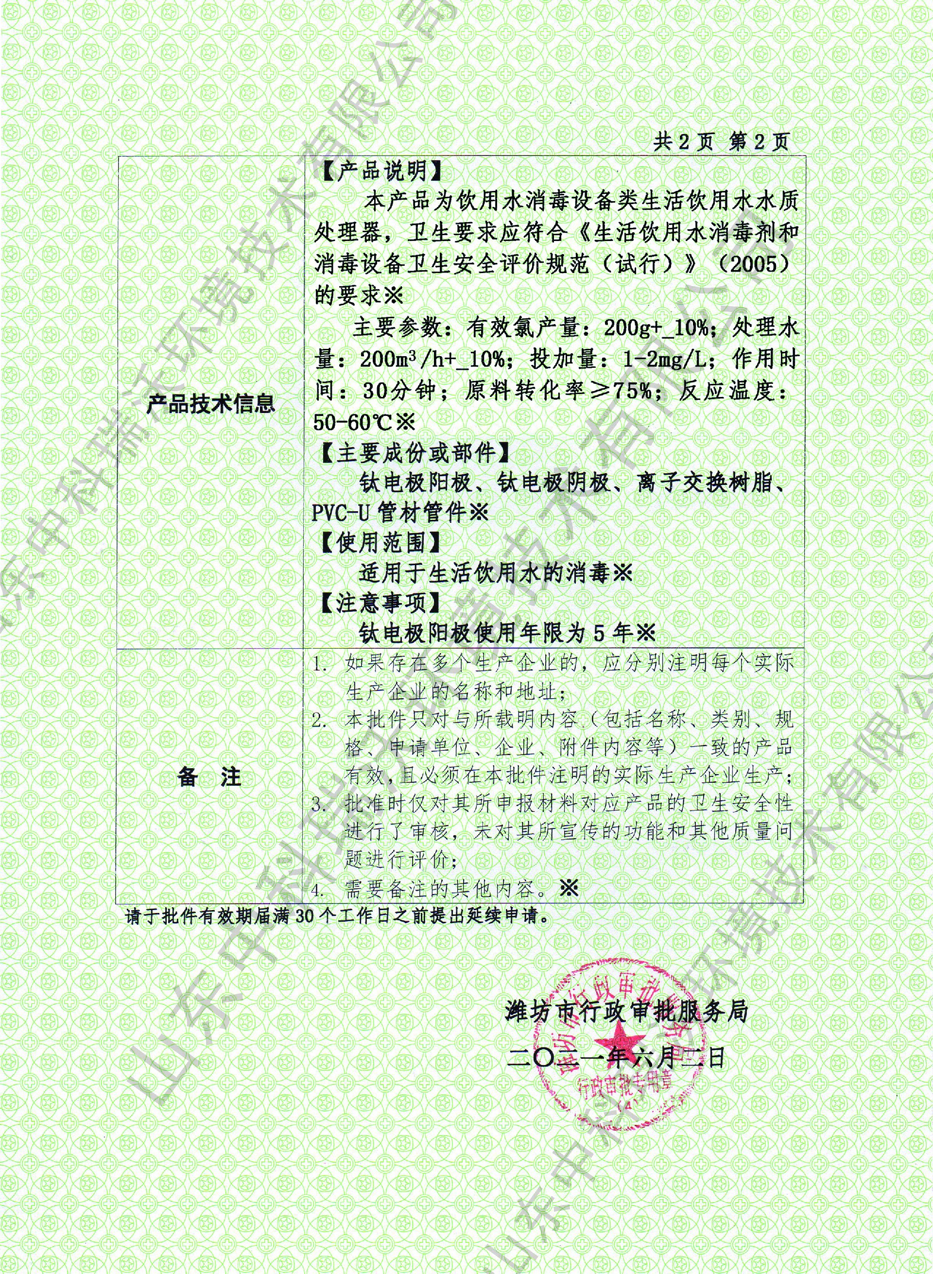 電解次氯酸鈉衛(wèi)生許可批件